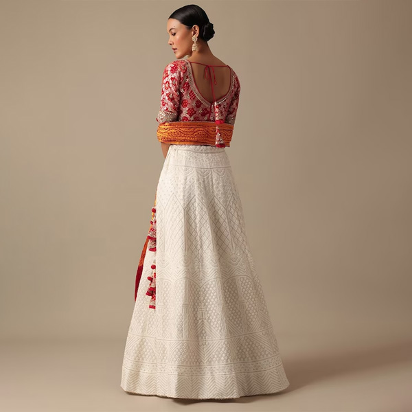 White, red & yellow embellished lehenga choli with dupatta,